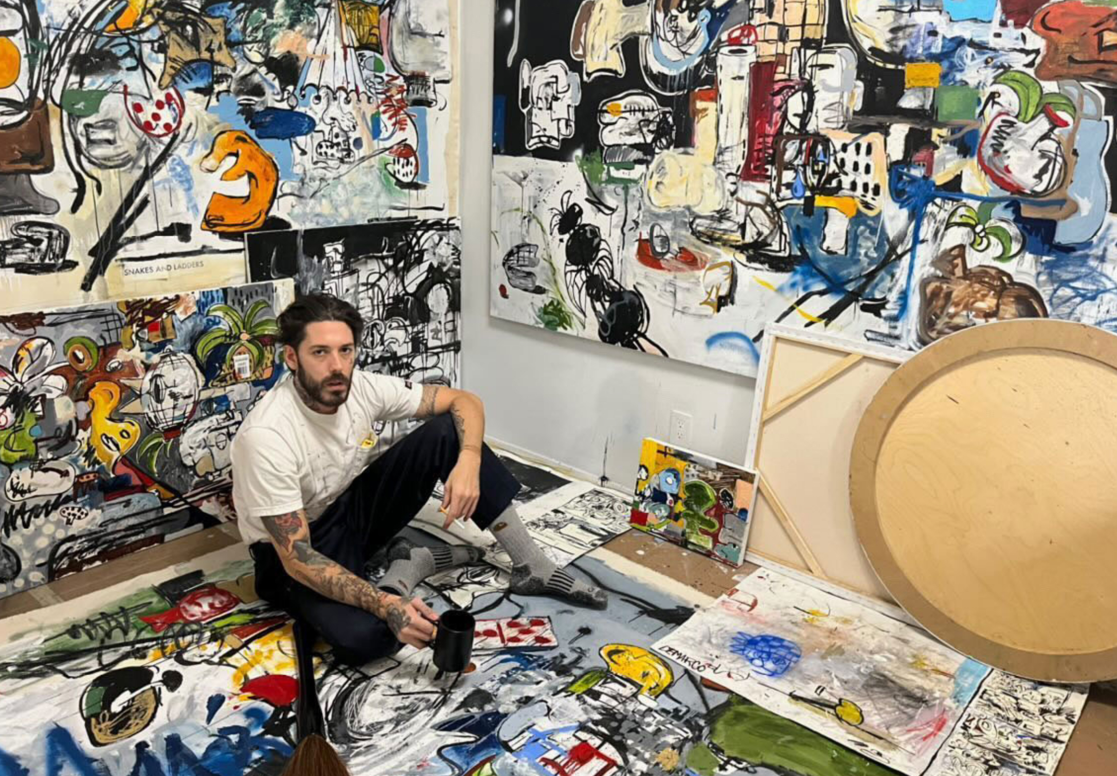 Many of his works have Japanese elements drawn from his time living in Tokyo and training under a tattoo master. Such impact can be seen at the work Snakes and Ladders in the umbrella with a foot, appearing on the right side of the composition.