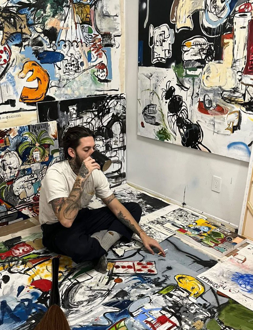 In his creation, DeMarco rarely sketches out a design before beginning working on a piece, preferring instead to discover the painting as he works. This allows him to preserve all of his original energy, spontaneity, and passion while painting; much like Japanese calligraphers masters who embrace the concept of "Wabi-Sabi". DeMarco's wild yet very organised compositions reflects his life experiences as well as his day-to-day activities.